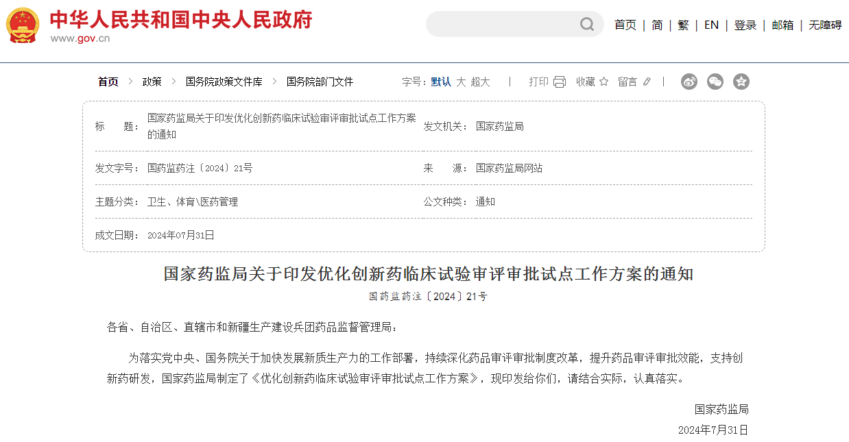 為落實(shí)黨中央、國務(wù)院關(guān)于加快發(fā)展新質(zhì)生產(chǎn)力的工作部署,持續(xù)深化藥品審評審批制度改革,提升藥品審評審批效能,支持創(chuàng)新藥研發(fā),國家藥監(jiān)局制定了《優(yōu)化創(chuàng)新藥臨床試驗(yàn)審評審批試點(diǎn)工作方案》,現(xiàn)印發(fā)給你們,請結(jié)合實(shí)際,認(rèn)真落實(shí)。