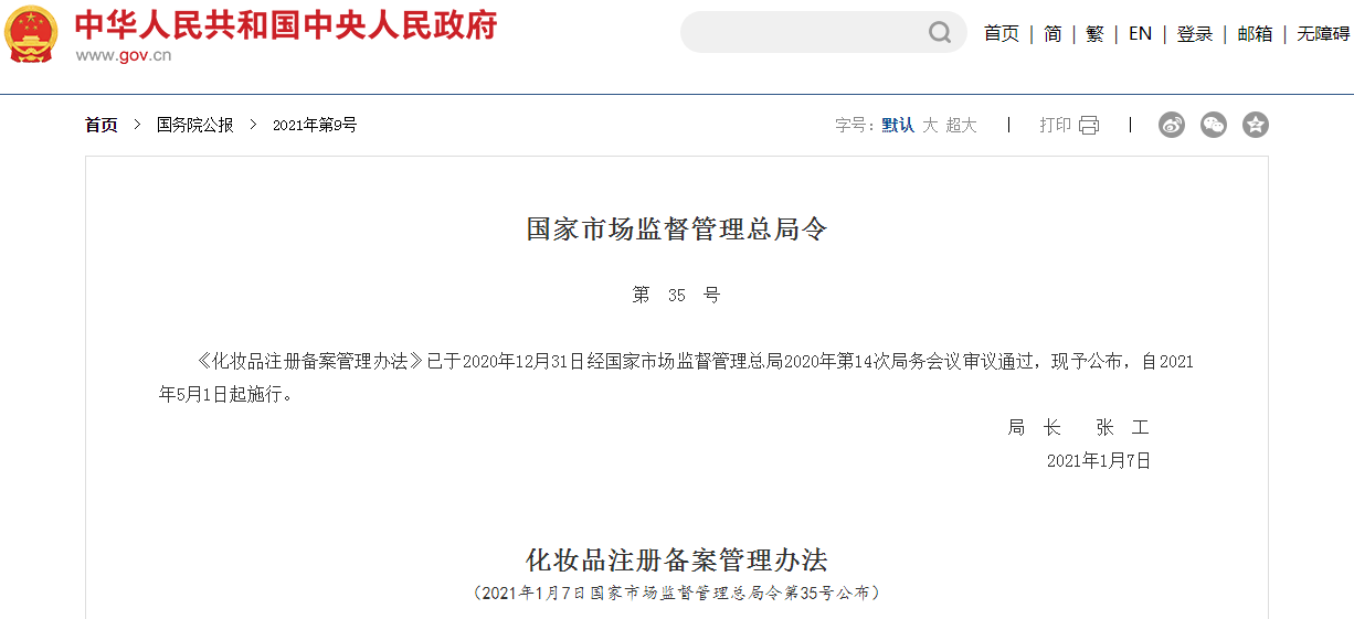 《化妝品注冊(cè)備案管理辦法》已于2020年12月31日經(jīng)國(guó)家市場(chǎng)監(jiān)督管理總局2020年第14次局務(wù)會(huì)議審議通過(guò),現(xiàn)予公布,自2021年5月1日起施行。