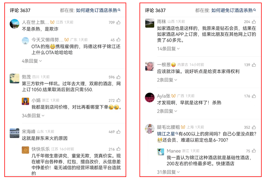 酒店及平臺回應(yīng):7 天優(yōu)品酒店(杭州西湖斷橋浙大店)客服人員回應(yīng)稱,酒店方提供給錦江薈和其他酒店預(yù)訂網(wǎng)站的價(jià)格是一致的,只是有的平臺有優(yōu)惠價(jià),門店預(yù)訂價(jià)格也比網(wǎng)上便宜。3 月 10 日下午,該酒店一名負(fù)責(zé)人稱,門店屬于錦江集團(tuán)旗下的特許經(jīng)營店,李先生當(dāng)時(shí)預(yù)訂的價(jià)格是誤調(diào),門店曾與他溝通按正常價(jià)格保證他入住,不過李先生拒絕了,明確表示不會入住門店,目前也還沒有到店。錦江薈客服表示,在同等預(yù)訂條件下,錦江薈個(gè)人會員通過官方線上渠道預(yù)訂酒店的客房最低價(jià),不會高于合作渠道,對于李先生反映的情況及錦江薈是否存在 “殺熟” 問題,將登記后由專人回復(fù)??头藛T還稱,涉事門店及第三方網(wǎng)站預(yù)訂價(jià)格比錦江薈便宜的情況屬于 “價(jià)格倒掛”,錦江酒店方面正在對旗下酒店管控類似行為。
