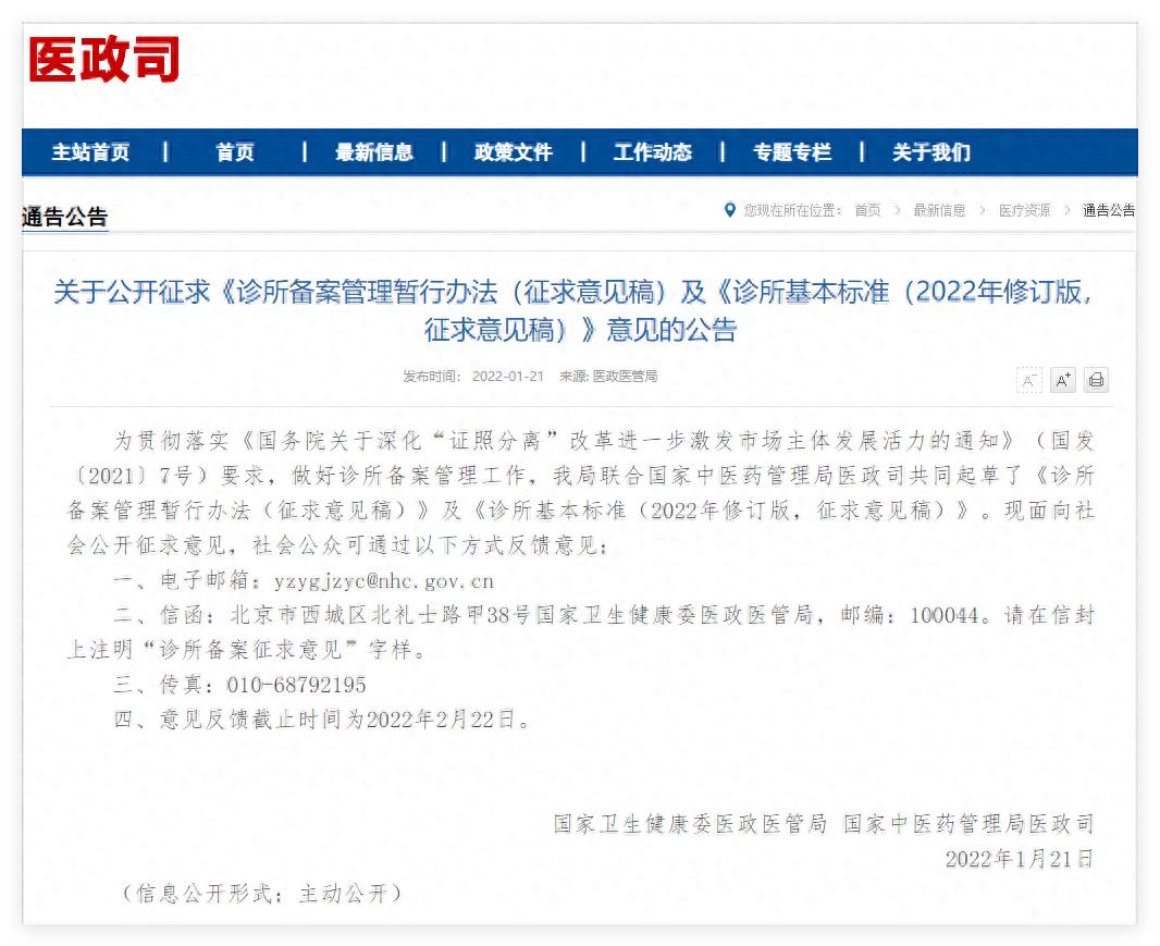 關于公開征求《診所備案管理暫行辦法(征求意見稿)及《診所基本標準(2022年修訂版,征求意見稿)》意見的公告