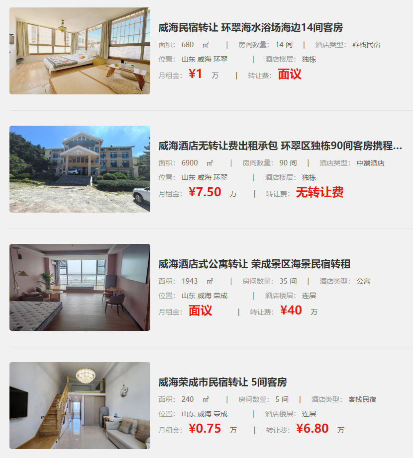 在威海環(huán)翠區(qū),攜程三鉆的中端酒店以“無轉(zhuǎn)讓費(fèi)”招租,90間客房月租僅7.5萬,相比深圳動輒百萬的租金堪稱“白菜價”??闪硪贿?,榮成景區(qū)海景民宿轉(zhuǎn)讓費(fèi)高達(dá)40萬,5間房的迷你民宿也要6.8萬轉(zhuǎn)讓費(fèi)。冰火兩重天的背后,是投資者對“現(xiàn)成貨”的偏愛——裝修成本高、翻新周期長的項目正在失寵。