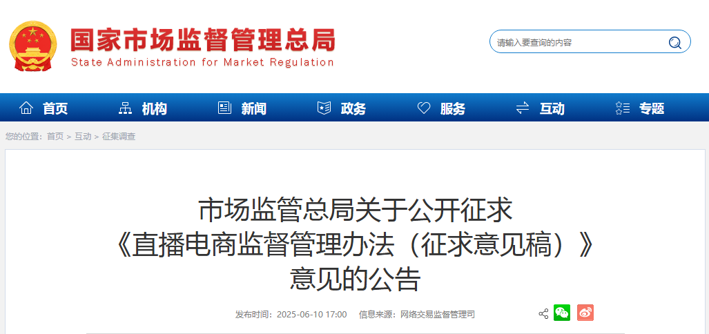 市監(jiān)總局關(guān)于公開《直播電商監(jiān)督管理辦法(征求意見稿)》意見的公告