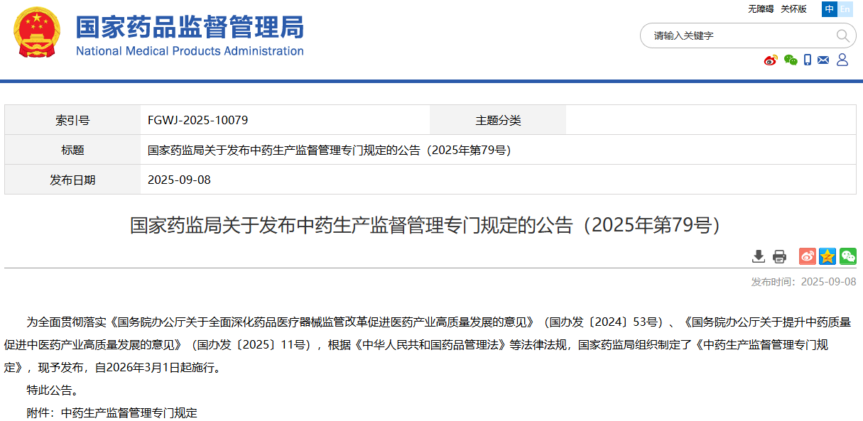 國家藥監(jiān)局關(guān)于發(fā)布中藥生產(chǎn)監(jiān)督管理專門規(guī)定的公告(2025年第79號)