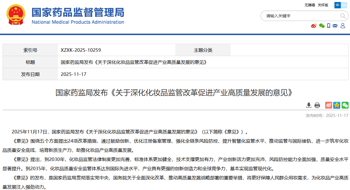 國(guó)家藥監(jiān)局關(guān)于深化化妝品監(jiān)管改革促進(jìn)產(chǎn)業(yè)高質(zhì)量發(fā)展的意見(jiàn)