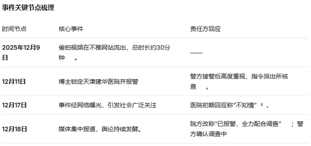 警覺的博主經(jīng)過兩天的篩查比對,結合護士口音等因素,最終將目標鎖定為天津建華醫(yī)院西青院區(qū),并于12月11日向天津警方報警。警方高度重視,指令轄區(qū)派出所立即介入核查。然而,與迅速行動的警方形成對比的,是涉事醫(yī)院起初令人困惑的沉默。在事件被媒體廣泛報道后,有記者聯(lián)系醫(yī)院,得到的回應卻是“不知道這件事,也沒有聽說過”。