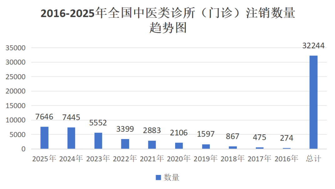 2025年,平均每天有21家中醫(yī)館注銷關(guān)閉。10年間,全國基層中醫(yī)館注銷總量超3.22萬家,年度注銷量從2016年約270家攀升至2025年約7600家,年均復合增長超20%。2021年(約2880家)是增長拐點,2023 - 2025年注銷量連續(xù)突破5000、7000、7600家,近五年注銷總量約2.7萬家,占近10年注銷總量的83%,行業(yè)出清速度加快。診鎖界對近10年基層中醫(yī)類診所(門診部)注銷數(shù)據(jù)展開多維度分析,原始數(shù)據(jù)來自企查查平臺,且注銷數(shù)據(jù)不包含吊銷等非正常狀態(tài),數(shù)據(jù)精準保守。