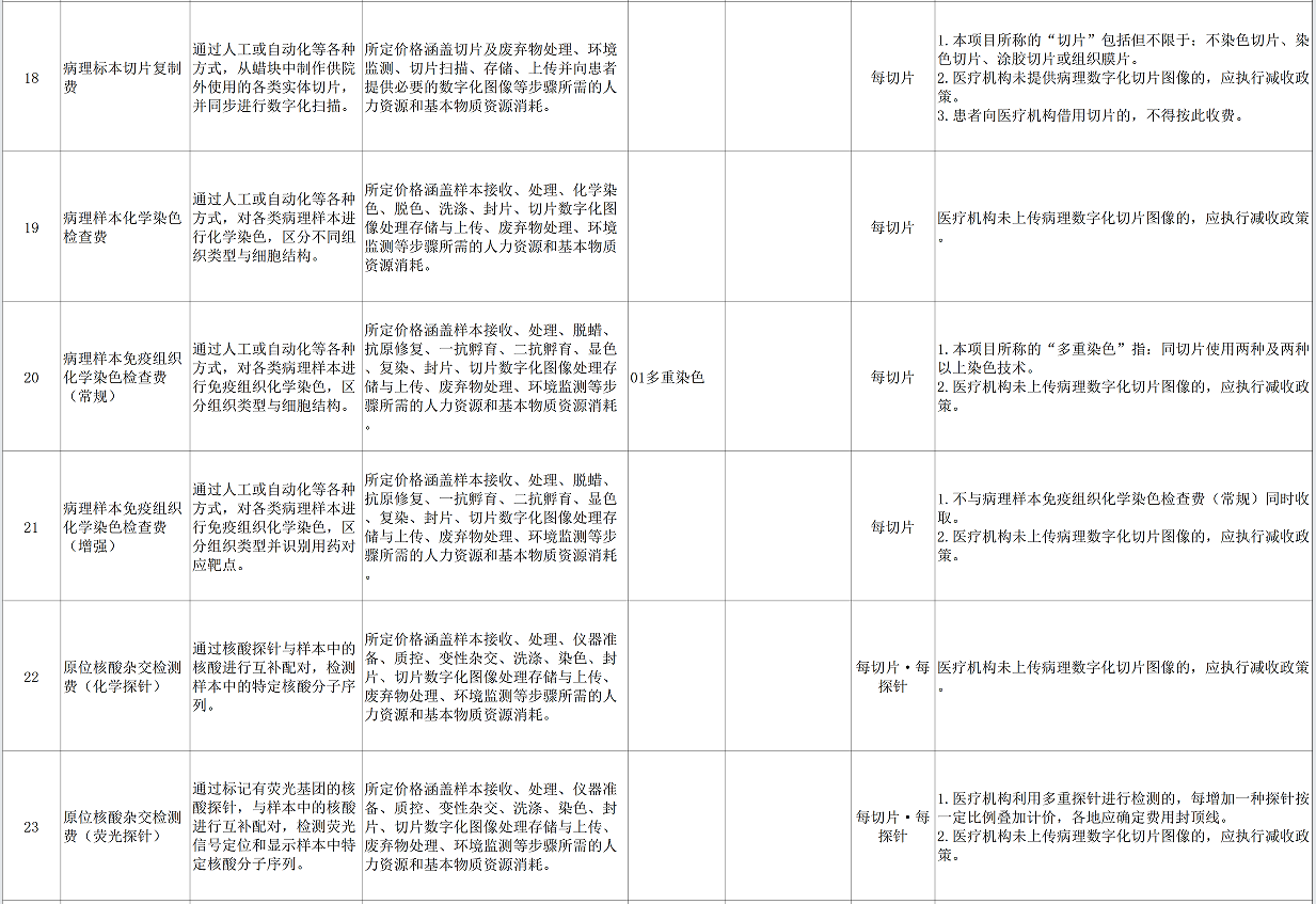 9.醫(yī)療機(jī)構(gòu)開展病理診斷時,應(yīng)上傳病理診斷報告,未上傳完整病理診斷報告的,在相應(yīng)項目政府指導(dǎo)價基礎(chǔ)上減收5元。醫(yī)療機(jī)構(gòu)開展病理樣本染色檢查、原位雜交、切片復(fù)制時,應(yīng)提供符合要求的“病理數(shù)字化切片圖像”,未提供“病理數(shù)字化切片圖像”的,在相應(yīng)項目政府指導(dǎo)價基礎(chǔ)上減收5元:單次檢查或復(fù)制多張切片的,按次減收不超過15元。