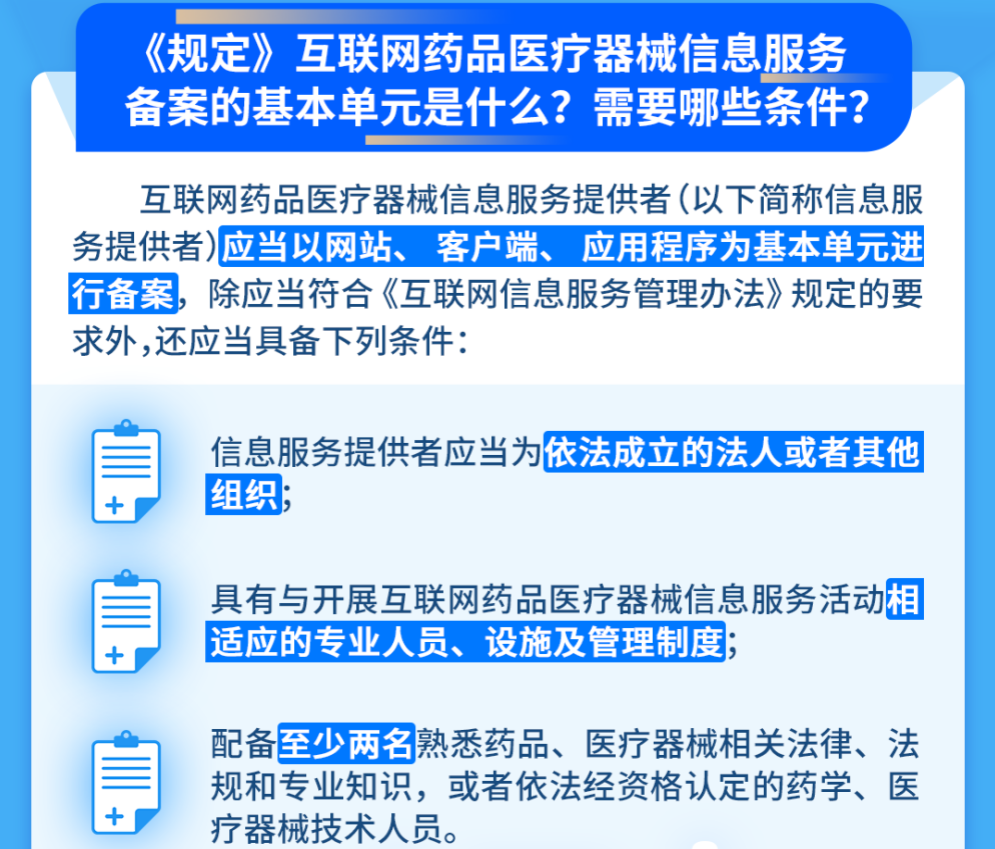 第四條 互聯(lián)網(wǎng)藥品醫(yī)療器械信息服務(wù)提供者(以下簡(jiǎn)稱信息服務(wù)提供者)應(yīng)當(dāng)以網(wǎng)站、客戶端、應(yīng)用程序?yàn)榛締卧M(jìn)行備案,除應(yīng)當(dāng)符合《互聯(lián)網(wǎng)信息服務(wù)管理辦法》規(guī)定的要求外,還應(yīng)當(dāng)具備下列條件: