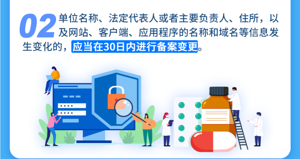 單位名稱、法定代表人或者主要負(fù)責(zé)人、住所,以及網(wǎng)站、客戶端、應(yīng)用程序的名稱和域名等信息發(fā)生變化的,應(yīng)當(dāng)在30日內(nèi)進(jìn)行備案變更。
