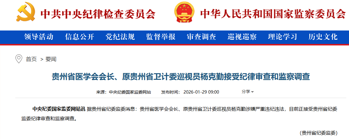 2026年1月29日,一則來(lái)自貴州省紀(jì)委監(jiān)委的通報(bào)在醫(yī)療系統(tǒng)和紀(jì)檢監(jiān)察領(lǐng)域引起震動(dòng)。通報(bào)指出,貴州省醫(yī)學(xué)會(huì)會(huì)長(zhǎng)、原貴州省衛(wèi)計(jì)委巡視員楊克勤涉嫌嚴(yán)重違紀(jì)違法。