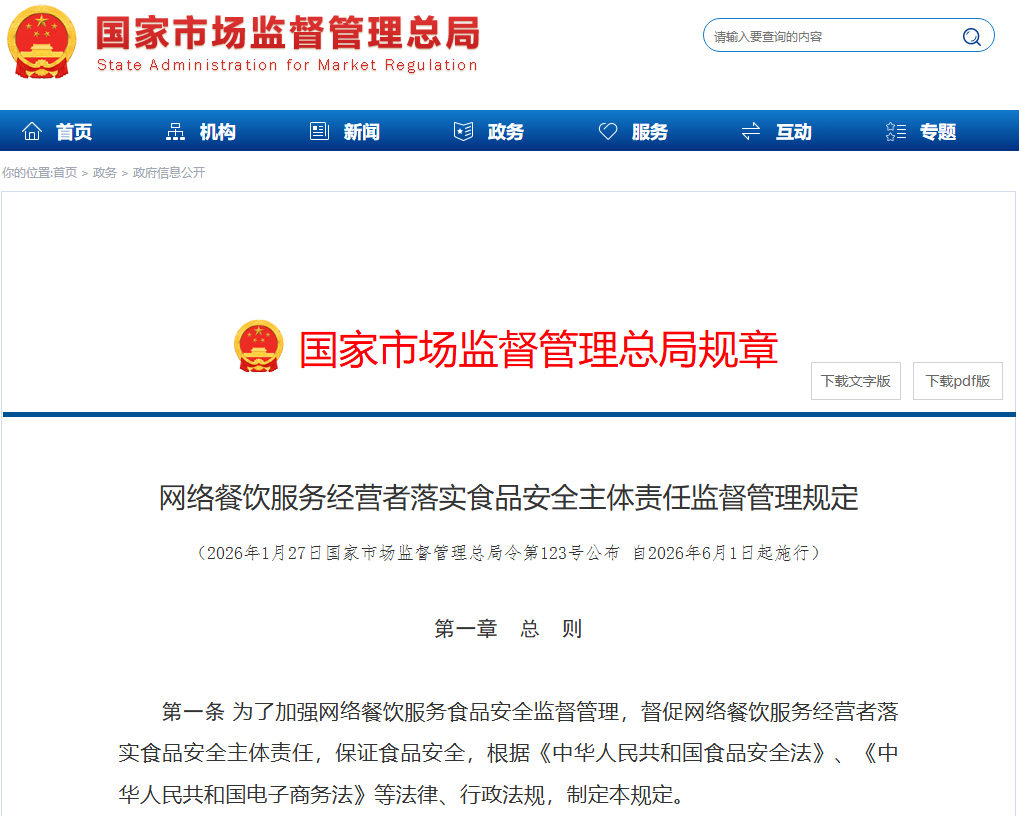 第一條 為了加強網絡餐飲服務食品安全監(jiān)督管理,督促網絡餐飲服務經營者落實食品安全主體責任,保證食品安全,根據《中華人民共和國食品安全法》、《中華人民共和國電子商務法》等法律、行政法規(guī),制定本規(guī)定。