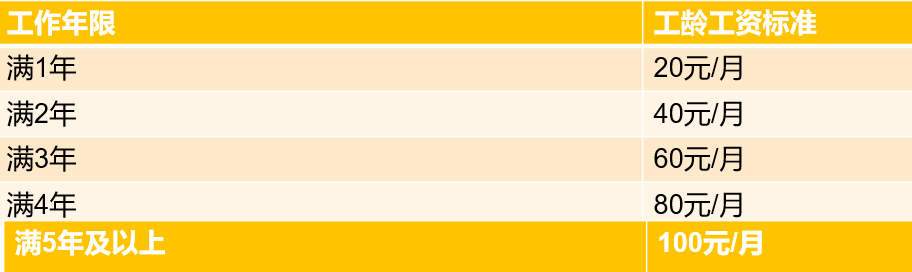 工齡工資:是按照員工在公司的工作年數(shù)計(jì)算發(fā)放的工資,每月20日(含)入職員工于次年當(dāng)月享受工齡工資。公司離職員工又返回的,以前的工作年數(shù)可以繼續(xù)使用,但工齡需減半。員工工作年限與工齡工資標(biāo)準(zhǔn)對照詳見下表: