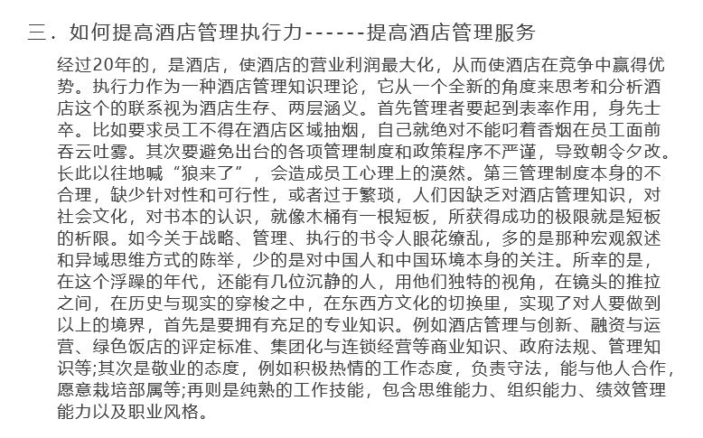 酒店的生命線。這里所將的管理包含了管理者及管理組織的運(yùn)營(yíng)特征,并將執(zhí)行力與對(duì)客建設(shè)的重要內(nèi)容。為了向客人提供“滿意+驚喜”的優(yōu)質(zhì)服務(wù),留住消費(fèi)者的心,每家酒店都動(dòng)足了腦筋,下足了功夫。從優(yōu)化組織管理結(jié)構(gòu),建立職業(yè)化的員工隊(duì)伍,加強(qiáng)對(duì)外公關(guān)與宣傳,到不斷在產(chǎn)品、服務(wù)上推陳出新。雖然辦法想了很多,工作也做了不少,但成效卻不十分盡如人意。隨著酒店管理知識(shí)研究的逐步深入,“執(zhí)行力”這個(gè)名詞從出現(xiàn),到頻繁地運(yùn)用于酒店行業(yè),只有短短一、兩年時(shí)間,但它卻掀起了一場(chǎng)前所未有的學(xué)習(xí)浪潮?!皟?yōu)質(zhì)的服務(wù)源于有效的執(zhí)行力”,這一理念已被越來(lái)越多的酒店管理者奉為經(jīng)典,他們從美國(guó)西點(diǎn)軍校二百多年長(zhǎng)盛不衰的案例上,清楚地看到了執(zhí)行力的魅力是如此驚人。