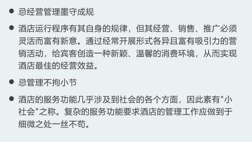 2、酒店管理依賴于制度,酒店的各項(xiàng)工作程序、標(biāo)準(zhǔn)、要求乃至各級(jí)人員的職責(zé)、任務(wù)、目標(biāo)、言談舉止等都被嚴(yán)格地規(guī)范于制度之中。"做什么,怎么做,做到什么程度,做錯(cuò)了將受到何種處罰"是酒店所有員工都非常清楚的,管理者只要按照制度去檢查要求,而無需隨主觀意志指手劃腳,更不能置制度于不顧,憑主觀情緒與想象任意要求下屬"如何做"。否則,員工將無所適從,管理程度也會(huì)因?yàn)楣芾碚咦陨淼脑蛟斐苫靵y。