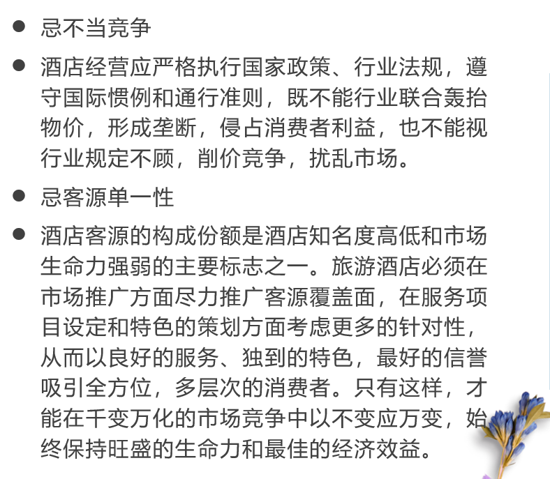 6、酒店管理講究可持續(xù)性,一切工作的計(jì)劃、方案、目標(biāo)、決策必須著眼于酒店的長(zhǎng)遠(yuǎn)利益,維護(hù)酒店永久的生命力和市場(chǎng)競(jìng)爭(zhēng)力。