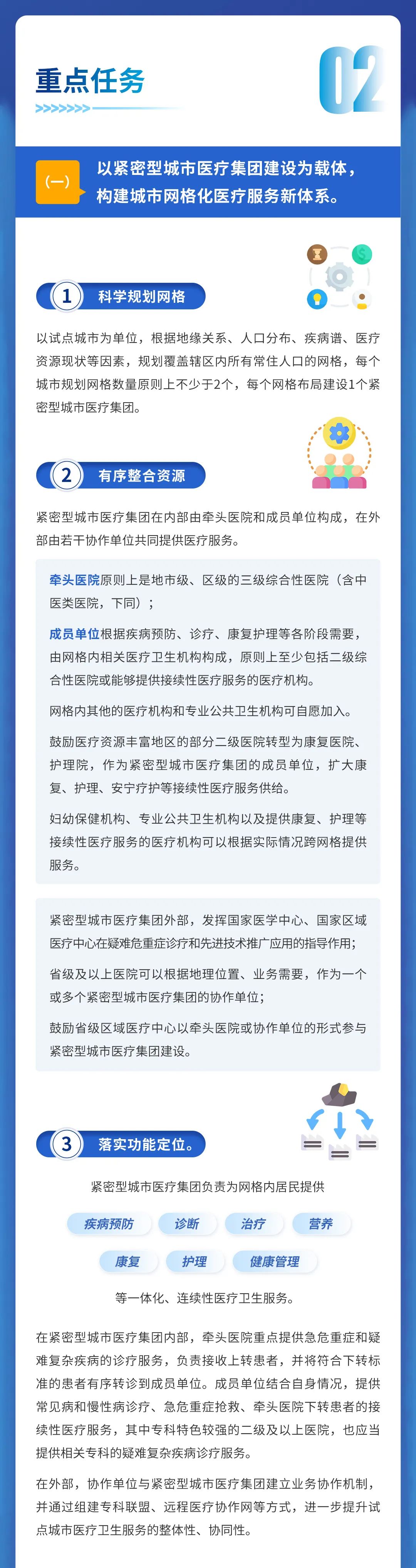 以習(xí)近平新時(shí)代中國(guó)特色社會(huì)主義思想為指導(dǎo),全面貫徹黨的二十大精神,推進(jìn)健康中國(guó)建設(shè),落實(shí)深化醫(yī)藥衛(wèi)生體制改革工作安排,在每個(gè)省份選擇2-3個(gè)設(shè)區(qū)的市(直轄市的區(qū)),統(tǒng)籌區(qū)域內(nèi)醫(yī)療資源,科學(xué)合理網(wǎng)格化布局緊密型城市醫(yī)療集團(tuán),推動(dòng)醫(yī)療服務(wù)供給側(cè)結(jié)構(gòu)性改革。到2023年上半年,試點(diǎn)城市完成緊密型城市醫(yī)療集團(tuán)網(wǎng)格化布局。