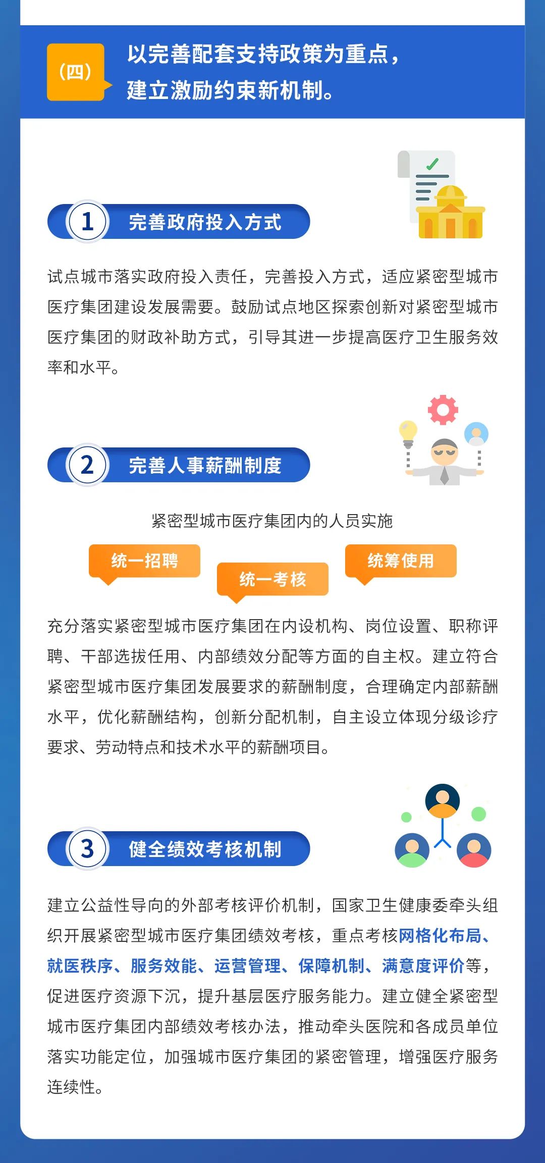 試點(diǎn)城市進(jìn)一步健全支持緊密型城市醫(yī)療集團(tuán)建設(shè)發(fā)展的配套政策,創(chuàng)新完善體制機(jī)制,推動(dòng)各級(jí)各類(lèi)醫(yī)療衛(wèi)生機(jī)構(gòu)落實(shí)功能定位,形成科學(xué)有序的就醫(yī)格局和系統(tǒng)連續(xù)的診療格局,不斷鞏固分級(jí)診療制度建設(shè)成效。到2023年底,基本形成系統(tǒng)集成的配套政策,推動(dòng)緊密型城市醫(yī)療集團(tuán)建設(shè)發(fā)展的體制機(jī)制取得新突破。