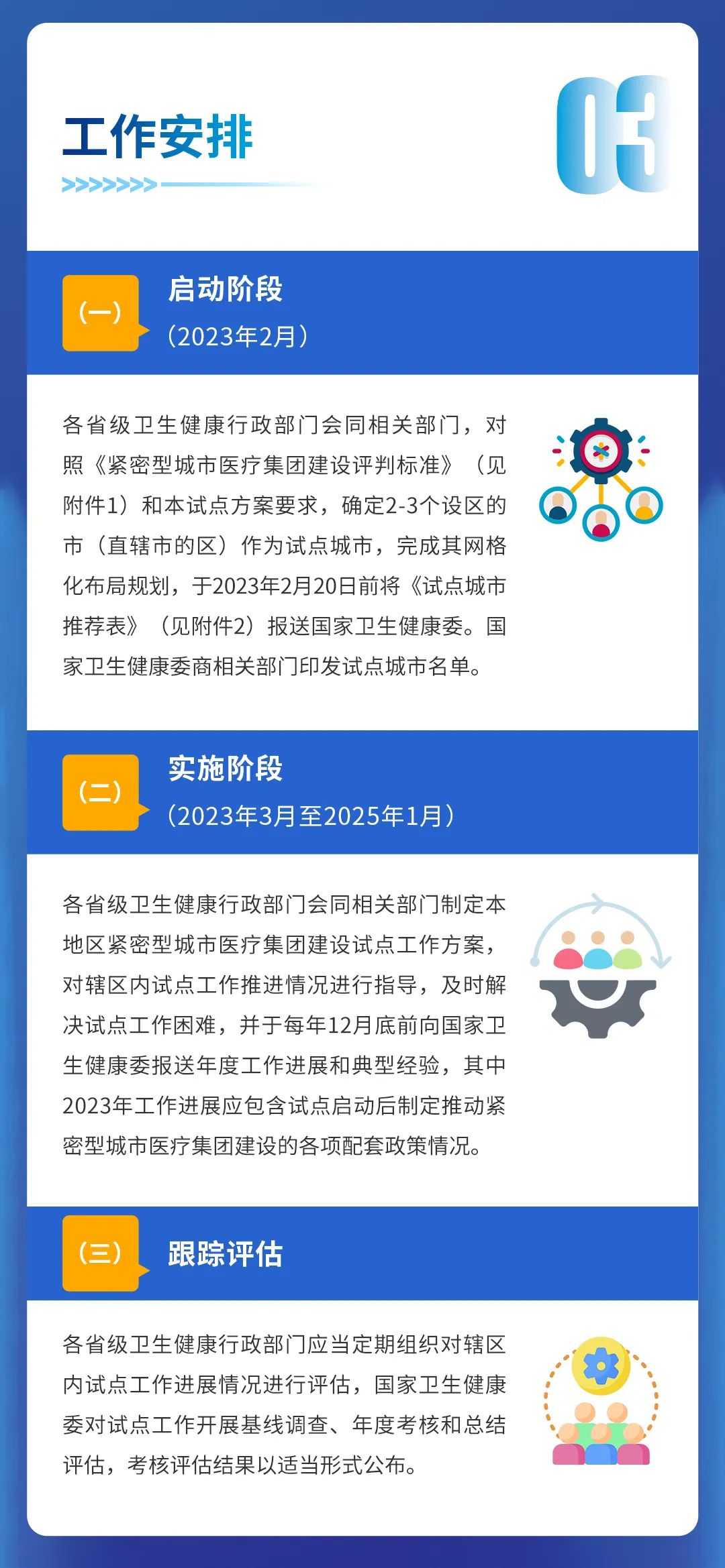 (二)實(shí)施階段(2023年3月至2025年1月)。各省級(jí)衛(wèi)生健康行政部門(mén)會(huì)同相關(guān)部門(mén)制定本地區(qū)緊密型城市醫(yī)療集團(tuán)建設(shè)試點(diǎn)工作方案,對(duì)轄區(qū)內(nèi)試點(diǎn)工作推進(jìn)情況進(jìn)行指導(dǎo),及時(shí)解決試點(diǎn)工作困難,并于每年12月底前向國(guó)家衛(wèi)生健康委報(bào)送年度工作進(jìn)展和典型經(jīng)驗(yàn),其中2023年工作進(jìn)展應(yīng)包含試點(diǎn)啟動(dòng)后制定推動(dòng)緊密型城市醫(yī)療集團(tuán)建設(shè)的各項(xiàng)配套政策情況。