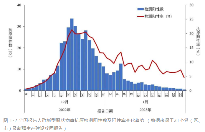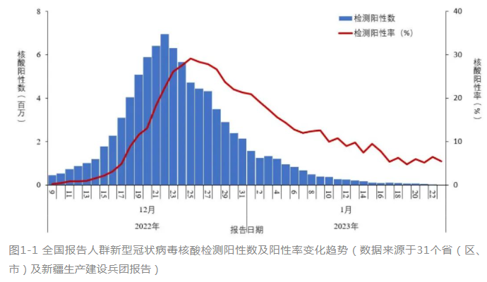 2022年12月9日以來,各省份報告人群核酸檢測陽性數(shù)及陽性率呈現(xiàn)先增加后降低趨勢,陽性人數(shù)12月22日達(dá)到高峰(694萬)后逐步下降,2023年1月23日降至最低1.5萬;檢測陽性率12月25日(29.2%)達(dá)高峰后逐步下降,1月23日降低到5.5%(圖1-1)。