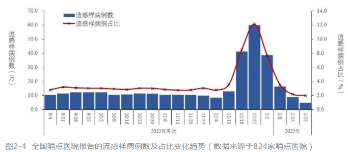 (四)哨點醫(yī)院監(jiān)測結(jié)果。2022年12月9日起,在我國已建立的824家流感監(jiān)測網(wǎng)絡(luò)哨點醫(yī)院(包括國家級哨點醫(yī)院546家、省級哨點醫(yī)院278家)和402家國家級網(wǎng)絡(luò)實驗室開展新冠病毒核酸檢測。結(jié)果顯示:2022年9月-12月上旬,哨點醫(yī)院每周流感樣病例(體溫≥38℃,伴咳嗽或咽痛之一)數(shù)量穩(wěn)定在10萬左右,至第51周(12月19日-25日)達(dá)到最高60萬;流感樣病例占門(急)診就診人數(shù)比值在2.7%-3.6%區(qū)間波動,第50周(12月12日-18日)明顯上升至8.5%,第51周達(dá)到最高12.1%,第52周起快速下降,2023年第3周(1月16日-月22日)已下降至2.0%,回落至本輪疫情之前水平(圖2-4)。