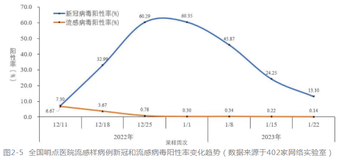 網(wǎng)絡(luò)實驗室對流感樣病例標(biāo)本同時進(jìn)行新冠病毒和流感病毒檢測,從2022年第49周(12月9日),新冠病毒陽性率開始逐漸增加,在第51和52周期間達(dá)峰值后開始波動下降;同期流感病毒陽性率則逐步降低,至12月下旬降至極低水平(圖2-5)。