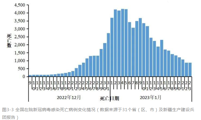 (三)在院新冠病毒感染死亡病例結(jié)果。在院新冠病毒感染死亡病例數(shù)于1月4日達(dá)到每日峰值4273,隨后持續(xù)下降,1月23日下降至896,較峰值下降79.0%(圖3-3)。