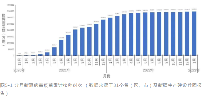 2020年12月15日全國啟動新冠病毒疫苗大規(guī)模接種后,接種速度明顯加快,5天完成1億劑次接種,單日最高接種2474萬劑次。我國積極穩(wěn)妥推進(jìn)接種工作,截至2023年1月20日,累計完成接種34.88億劑次(圖5-1)。全人群第一劑次、全程接種覆蓋比例分別達(dá)到92.9%和90.5%(圖5-2)。