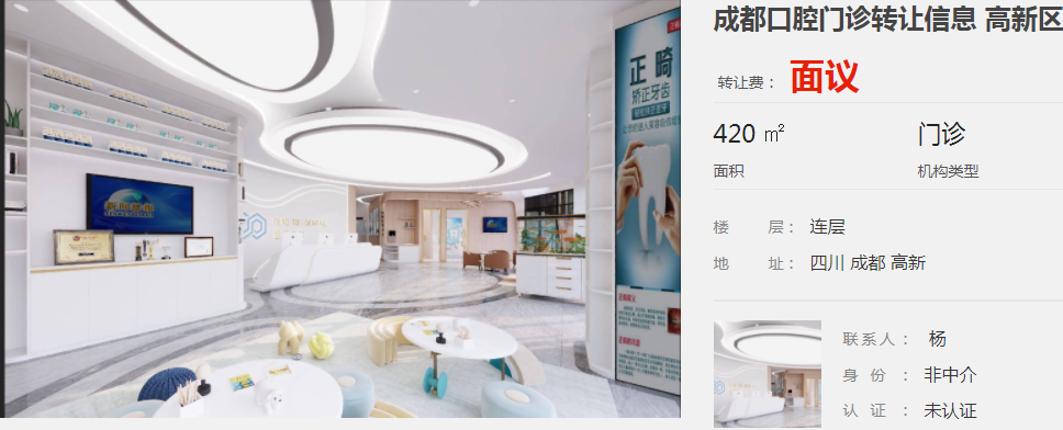 成都高新區(qū)黃金地段高端牙科門診《轉(zhuǎn)或者合作》,裝修好,地段完美,周邊高端佳宅輻射十萬人,幾所國際學(xué)校,小學(xué)初中學(xué)生 2W,消費力強,客戶素質(zhì)高。目前團隊穩(wěn)定,周邊口碑良好,現(xiàn)因老板移民無多余精力管理,整體轉(zhuǎn)或者合作,有5臺牙椅,9間診室房間,面積為410-420左右,設(shè)備齊全,包含CT等,裝修豪華,覆蓋周邊小區(qū)數(shù)十萬人,潛力巨大,醫(yī)護團隊穩(wěn)定。有意者聯(lián)系.