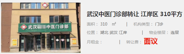 武漢某中醫(yī)門診部:科目四個(gè),中醫(yī)科,西醫(yī)內(nèi)科,口腔科與放射科。于2020年12月15日開(kāi)業(yè)應(yīng)診,二證齊全,于2022年7月正式上線武漢市醫(yī)療保險(xiǎn)。房屋二層面積310平方米.因本人業(yè)務(wù)轉(zhuǎn)型欲轉(zhuǎn)該門診。