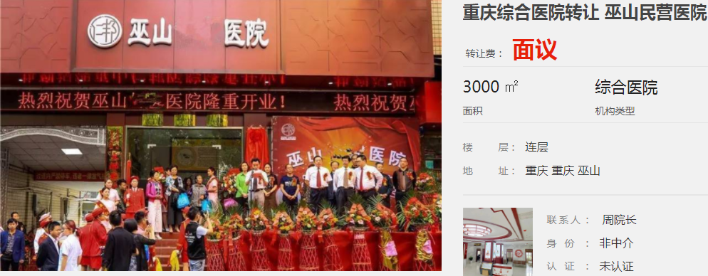 重慶綜合醫(yī)院轉(zhuǎn)讓 巫山民營醫(yī)院出讓 3千平