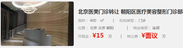 朝陽區(qū) 醫(yī)療美容門診部轉(zhuǎn)讓 面積400平米 成立4年多 正常營業(yè)中 包含:醫(yī)療美容科 | 美容外科 | 美容牙科 | 美容皮膚科 /醫(yī)學(xué)檢驗科等 房租:15萬/月 轉(zhuǎn)讓費用:面議
