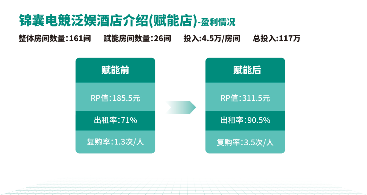 錦囊青年酒店的賦能改造方式,對傳統(tǒng)酒店的營收生態(tài)賦能效果顯著。據(jù)統(tǒng)計,錦囊電競泛娛酒店賦能店賦能前RP值為185.5元,賦能改造后RP提升到了311.5元;出租率由71%提升到90.5%;復(fù)購率由1.3次/人提升到3.5次/人,翻了兩番。
