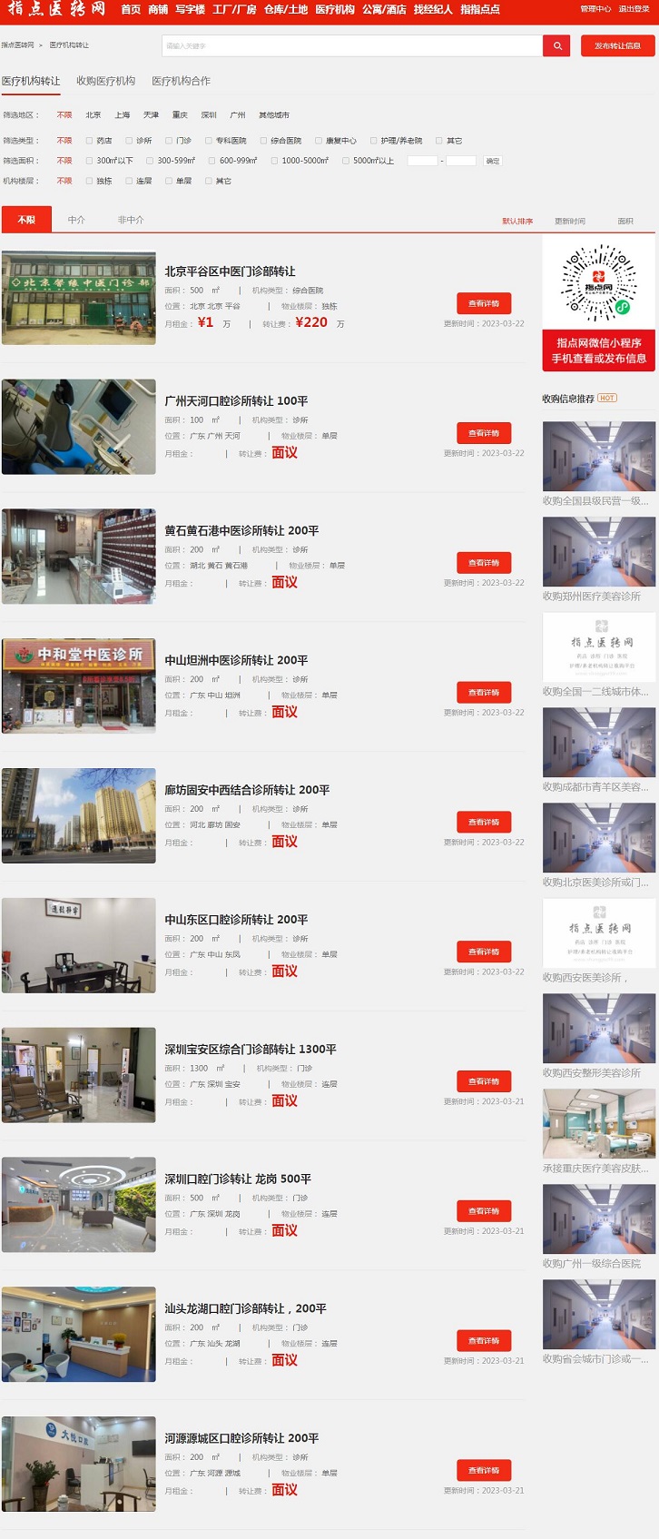 目前市場(chǎng)上還沒有一個(gè)專業(yè)的醫(yī)療機(jī)構(gòu)轉(zhuǎn)讓平臺(tái),指點(diǎn)網(wǎng)https://yl.shangpu99.com/是免費(fèi)發(fā)布信息。重點(diǎn)著手專注于民營(yíng)醫(yī)療機(jī)構(gòu)轉(zhuǎn)讓業(yè)務(wù),有想轉(zhuǎn)讓或想收購的都可以免費(fèi)注冊(cè)發(fā)布信息。