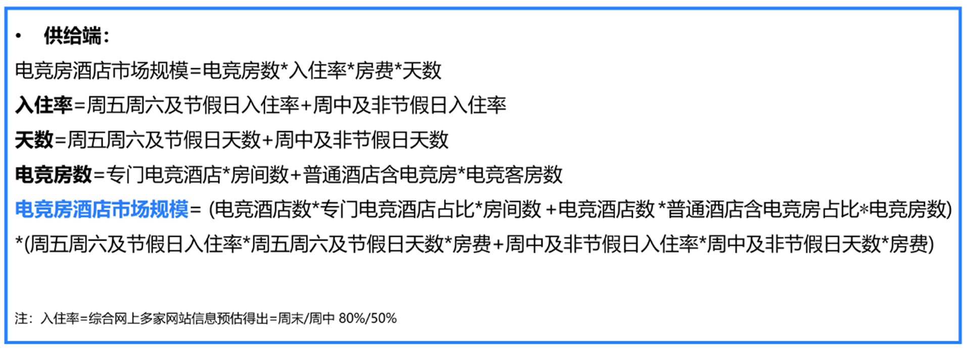 2.2 中國電競酒店市場規(guī)模從供給端進(jìn)行測算,根據(jù)電競酒店的數(shù)量、不同類型電競酒店的比例、淡旺季入住率及房費差別,估算出2022年電競酒店市場規(guī)模約為143億,預(yù)期2023年電競酒店市場規(guī)模預(yù)期能達(dá)到192億。