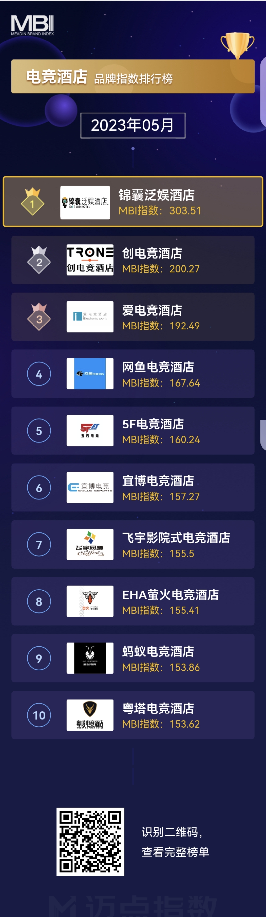 邁點網(wǎng)于2023年6月公布5月電競酒店品牌排行