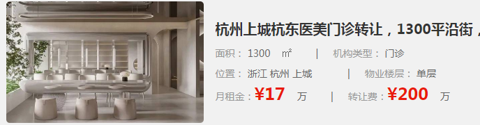 另外,還有一家位于上城區(qū)錢江新城的醫(yī)美門診正在轉(zhuǎn)讓,面積為3000平方米,月租金為30萬(wàn),轉(zhuǎn)讓費(fèi)為200萬(wàn),裝修為3星