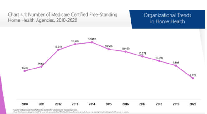 在過去的幾年中,現(xiàn)有的家庭保健機構的數(shù)量穩(wěn)步減少。根據(jù)家庭護理研究所的 2022 年家庭護理圖表,2020 年有 9,378 個機構,而 2019 年和 2014 年分別為 9,893 個和 10,852 個。