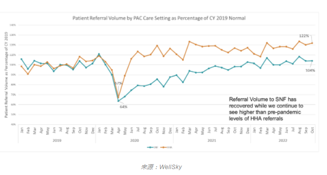 SNF-at-home 模型和 SNF 轉(zhuǎn)向家庭健康總體上成為熱門話題。但到 2023 年,HHCN 認為這種情況會放緩。一方面,SNF 轉(zhuǎn)介已經(jīng)反彈。事實上,根據(jù) WellSky 的數(shù)據(jù),它們是大流行之前的 104% 。