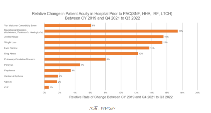 根據(jù) WellSky 的數(shù)據(jù), 2022 年 10 月患者在醫(yī)院內(nèi)的平均住院時間比 2019 年 10 月長了 11% 。與此同時,與過去相比,患者更有可能患上肌肉疾病、酒精或藥物濫用以及體重減輕。
