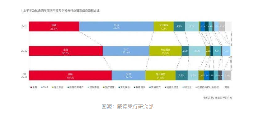 2021年,TMT行業(yè)在深圳甲級寫字樓的租賃成交面積占比為38.1%,但到2022年下降至23.0%,今年上半年進一步降至16.7%。與此相反,金融行業(yè)的租賃占比從2021年開始一直呈上升趨勢。