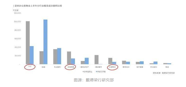 值得注意的是,TMT(科技、媒體和通信)、貿易零售、交通物流等行業(yè)在上半年深圳甲級寫字樓市場的租賃面積有所下降。然而,在優(yōu)質研發(fā)和乙級寫字樓等非甲級物業(yè)的租賃市場活躍度較高。