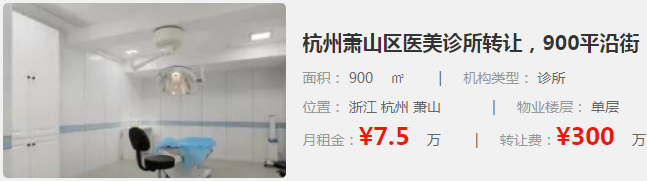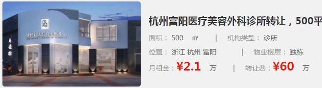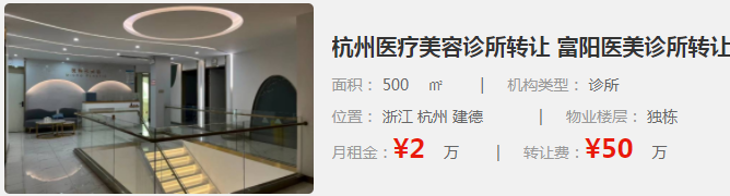 3. 杭州富陽區(qū)醫(yī)美診所轉(zhuǎn)讓,500平盈利中,月租金2萬,轉(zhuǎn)讓費88萬。