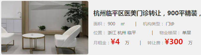 4. 杭州臨平區(qū)醫(yī)美診所轉(zhuǎn)讓,260平精裝修,月租金2萬,轉(zhuǎn)讓費40萬。