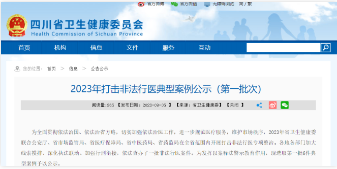 打擊非法行醫(yī)的態(tài)勢越發(fā)明朗。9月5日,四川省公布了全省范圍內(nèi)開展打擊非法行醫(yī)專項整治的第一批公示,選取了6例典型,涉及醫(yī)美、口腔診療、利用抖音非法行醫(yī)等。