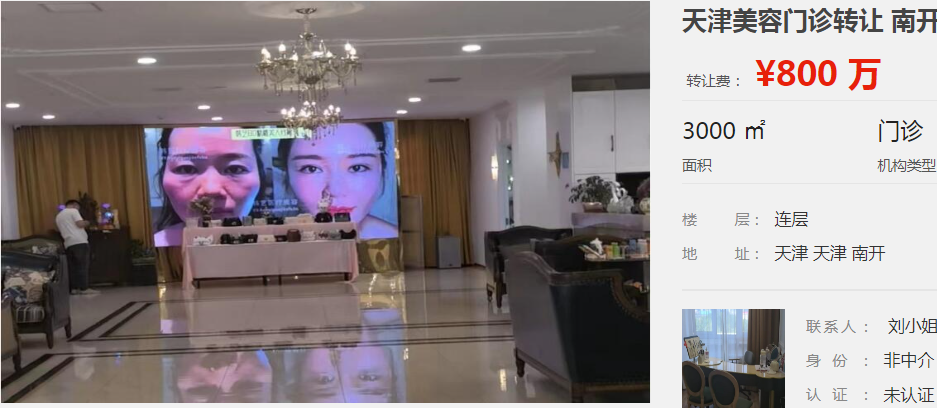 天津南開區(qū)3000平方米的美容門診轉(zhuǎn)讓,月租金為16萬元,轉(zhuǎn)讓費(fèi)為800萬元。