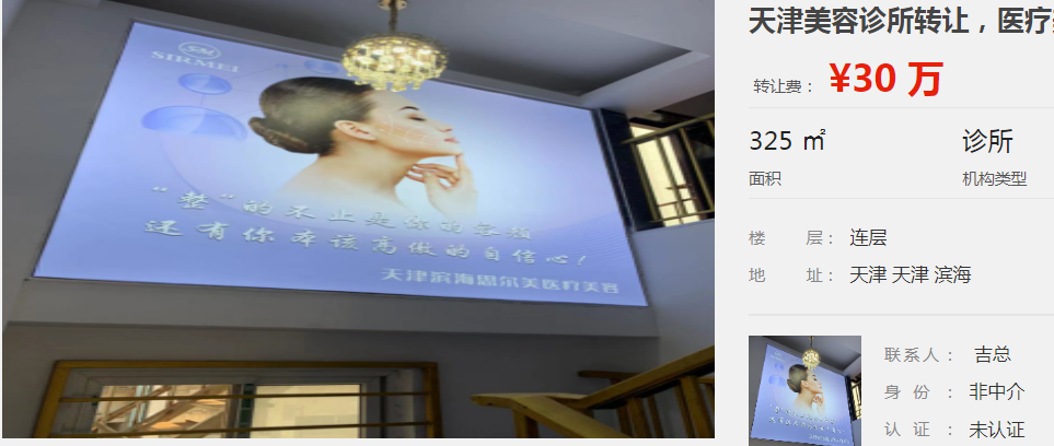 天津和平區(qū)700平方米的美容門診部轉(zhuǎn)讓,未提及月租金,轉(zhuǎn)讓費(fèi)為面議。