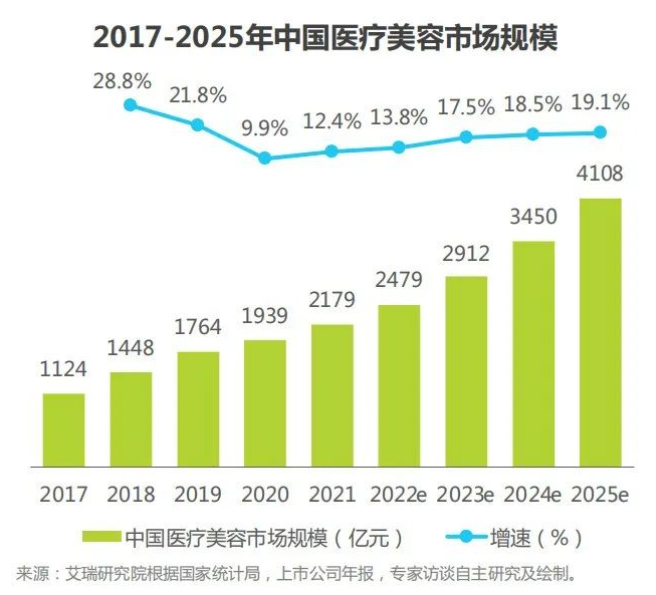 根據(jù)國家統(tǒng)計(jì)局的數(shù)據(jù),2021年中國醫(yī)療美容市場規(guī)模達(dá)到2179億元,增長率達(dá)到12.4%,預(yù)計(jì)2025年中國醫(yī)美市場規(guī)模有望達(dá)到4108億元(21年至25年 CAGR為17.2%)。