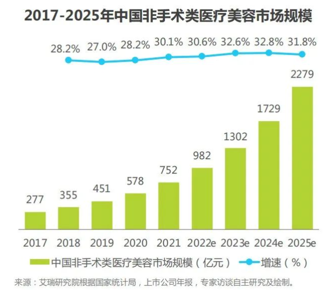 與手術(shù)類醫(yī)美相比,輕醫(yī)美的無創(chuàng)或微創(chuàng)醫(yī)學(xué)療法因操作簡單、創(chuàng)傷小、恢復(fù)期短、風(fēng)險(xiǎn)低的優(yōu)勢大大降低了消費(fèi)者的決策成本,成功保持高增速擴(kuò)張并擠壓手術(shù)市場。2021年中國非手術(shù)類醫(yī)療美容市場規(guī)模達(dá)752億元,預(yù)計(jì)2025年市場規(guī)模將上升至2279億元(21年至25年CAGR為31.9%),有望成為醫(yī)美主力市場。
