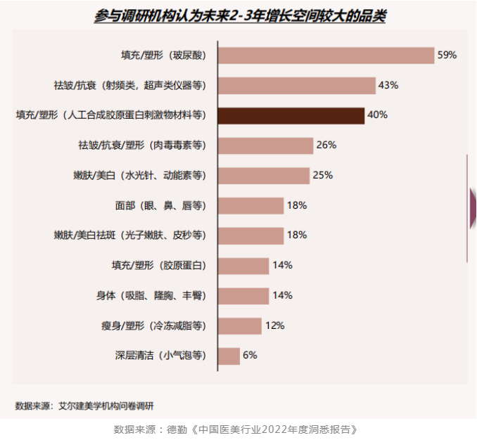 近年來,中國出現(xiàn)了多家大型連鎖整形美容機(jī)構(gòu),比如美萊醫(yī)學(xué)美容、華美醫(yī)學(xué)美容、曙光醫(yī)學(xué)美容等。這些機(jī)構(gòu)在全國范圍內(nèi)擁有多家分支機(jī)構(gòu),以打造品牌效應(yīng)和網(wǎng)絡(luò)優(yōu)勢,更好滿足消費(fèi)者需求。在從業(yè)轉(zhuǎn)型層面,輕醫(yī)美依然是當(dāng)下階段的美業(yè)重點(diǎn),以下類別有望成為未來兩到三年的增長品類。
