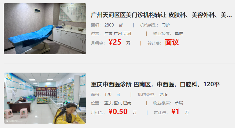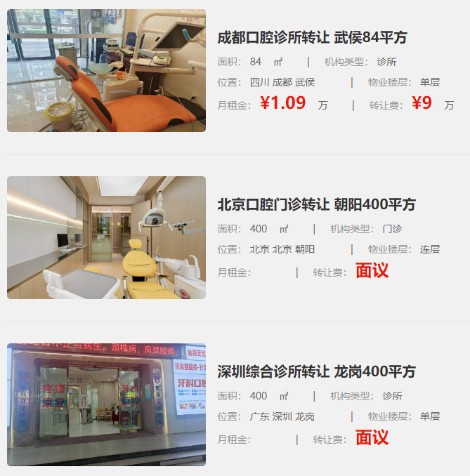 同時(shí),成都武侯區(qū)一家口腔診所因股東要去其他地方發(fā)展而轉(zhuǎn)讓,該診所擁有兩臺(tái)牙椅,設(shè)備齊全,沒(méi)有CT但其他都有。此外,北京朝陽(yáng)區(qū)一家口腔門診部也在尋求轉(zhuǎn)讓中,周邊小區(qū)多,附近有學(xué)校和三甲醫(yī)院,具備優(yōu)質(zhì)的消費(fèi)水平和高人流量。